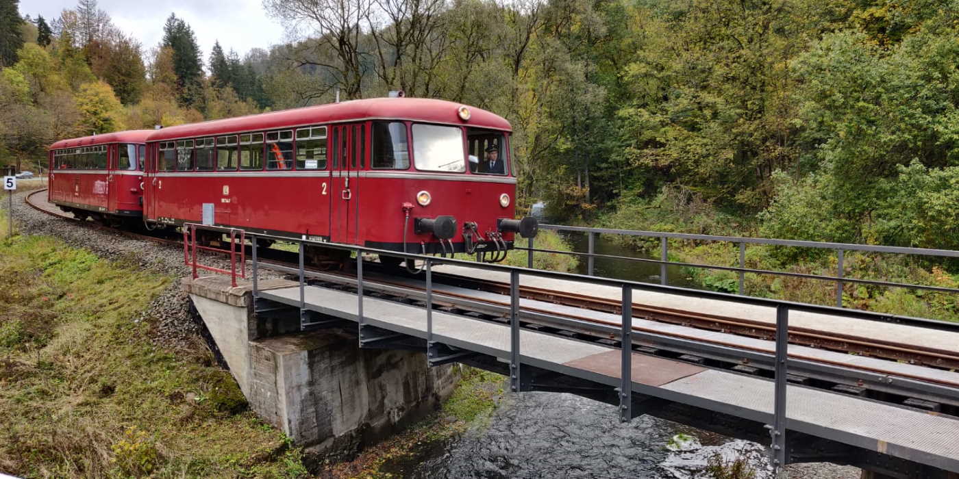 Unsere Spendenaktion zur Sanierung der Goldbachbrücke ist abgeschlossen. Dank der teils großzügigen finanziellen Unterstützung konnten wir das Brückenbauwerk erneuern lassen und zwischenzeitlich auch wieder einbauen. Unsere Strecke ist daher wieder durchgängig befahrbar, die Probefahrten mit unserer Schienenbusgarnitur verliefen reibungslos. Wir bedanken uns daher auf diesem Weg bei der ausführenden Firma, der Brückenwerkstatt Dresden von DB Bahnbau, bei den ehrenamtlichen Mitarbeitern sowie vor allem bei den Unterstützern, die durch ihre Spenden über das Crowdfunding und unsere Vereinskonten die Fortführung des Museumsbahnbetriebes ermöglicht haben.